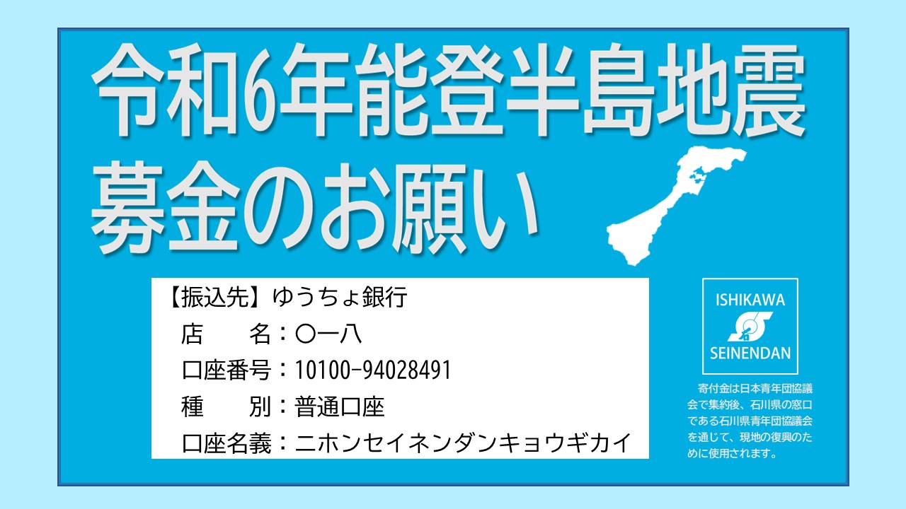 被災されたみなさまが笑顔を取り戻せるよう、全国の青年団をつなぐ私たち日本青年団協議会は、石川県内の青年団の窓口である石川県青年団協議会と連携し、募金活動を行うこととなりました。