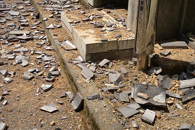 熊本地震時の竹田市の被害状況1。竹田総合庁舎(職場)の屋根瓦が大量に落下。