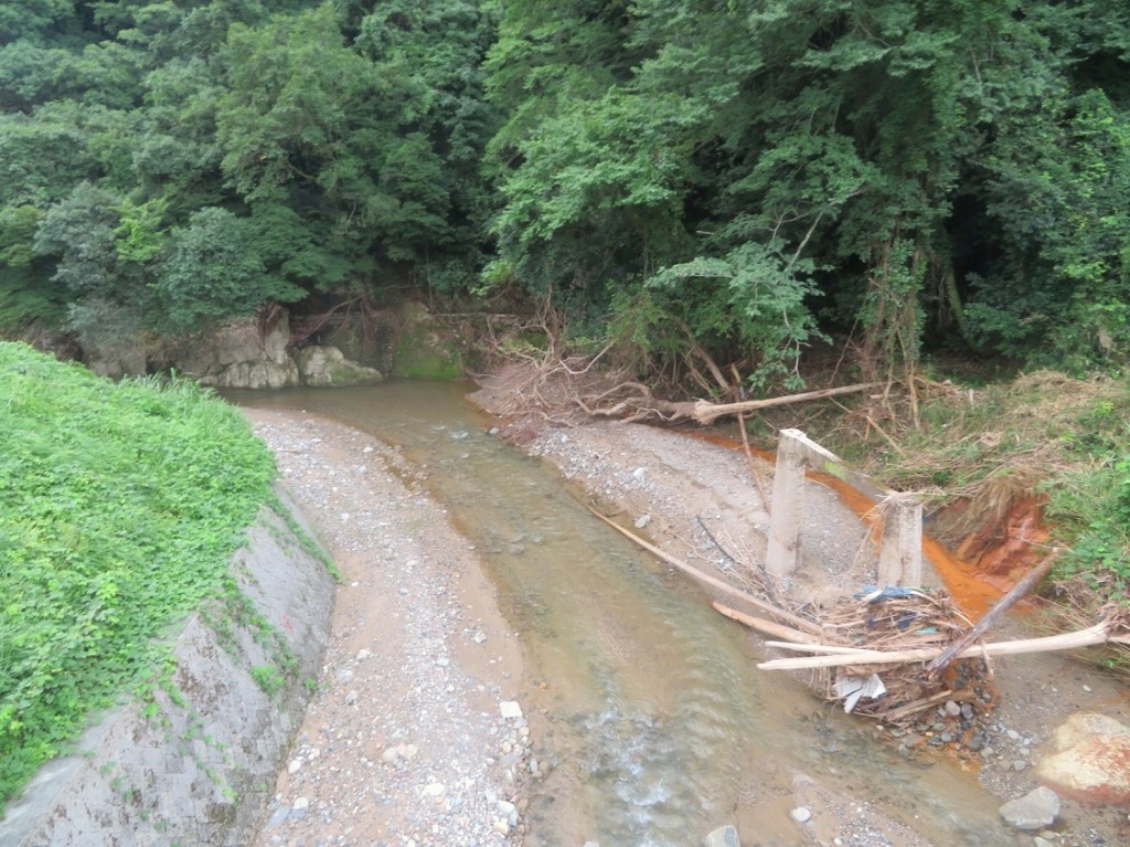 写真3:福岡県東峰村宝珠山地区での被害状況写真。役場宝珠山庁舎近くの河川。豪雨から1カ月以上経過も、依然流木や土砂で川が埋められている。