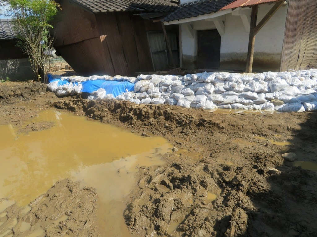 写真6:ボランティア現地の様子。奥の土嚢袋および排水路をボランティアの手で作成。手前の土砂や水たまりは、後日、土木業者などプロに任せることとなった。