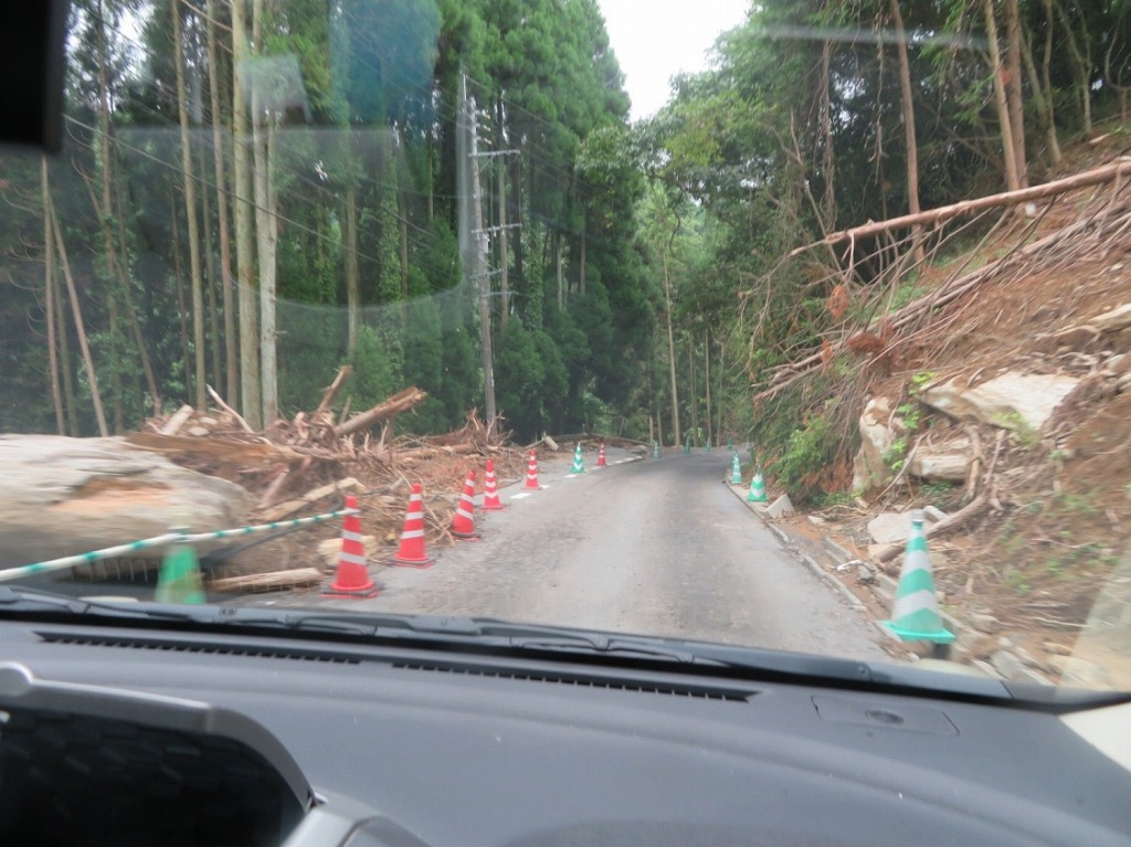 写真9:福岡県東峰村に向かう際に通った、大分県日田市大鶴地区の道路。大分県で最も被害の大きかった地区。豪雨から1カ月以上経っても、道路が大幅に崩落したままだった(片側1車線が崩落)。