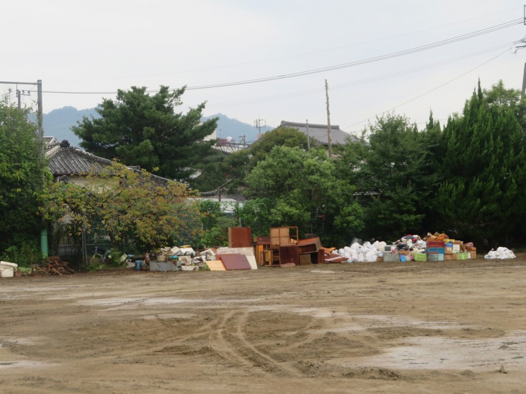 写真11:津久見市役所グラウンド。大量の災害がれきが置かれていた。