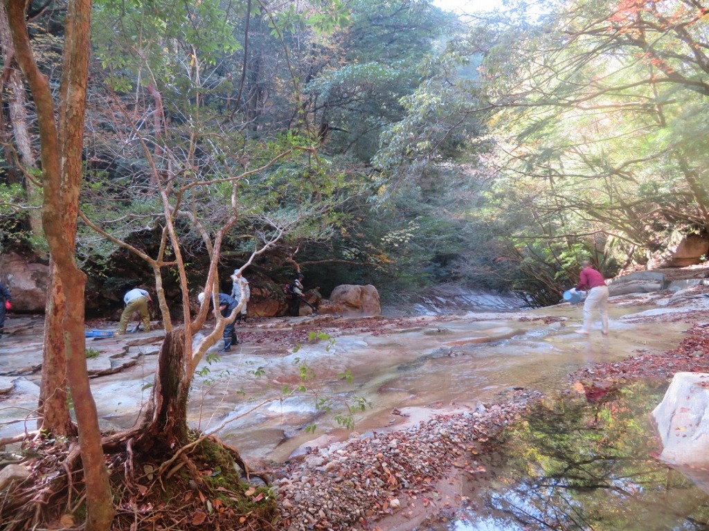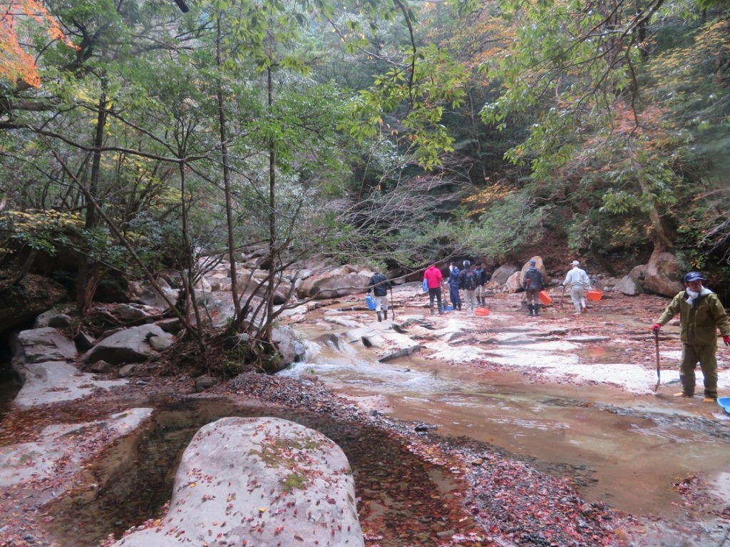 作業は体力勝負で、大変困難なものであった。渓谷に滞留する土砂や岩石を、人力で、バケツリレーで運ぶのだ。というのも、渓谷は幹線道路から細い山道を通り、1時間弱の場所にあり。重機が入ることのできない環境にある。 だから、人力でしか運び出せない。200m以上あるルートを、50名ほどのメンバーでバケツリレー。渓谷から土砂搬入先である駐車場まで、100段ほどある階段を登って運ぶ。土砂量は非常に多く、休憩時間も少なく、計5時間ほど作業した。 腰を痛めるほど大変だった。しかし、おかげで渓谷は大いに美しくなった。