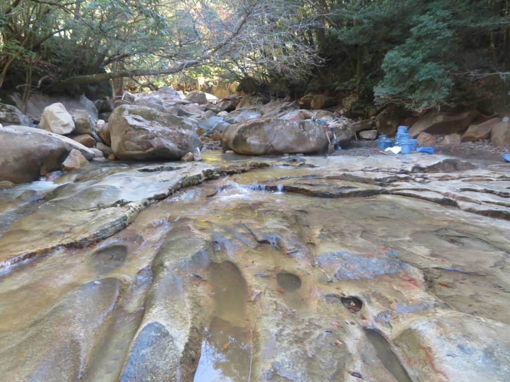 作業の現場は、藤河内(ふじかわち)渓谷だ。祖母傾(そぼかたむき)国定公園にある渓谷で、平成29年にユネスコ・エコパークに認定された、今後世界から注目されるであろう渓谷だ。白い花崗岩とコバルトブルーの清流が織りなす、心惹かれる渓谷だ。